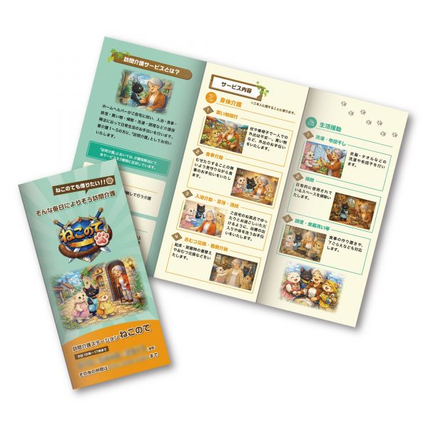 訪問介護サービスを運営されている企業様のリーフレットを制作致しました。 介護という堅い印象になりがちなサービス内容をイラストの持つ力で「優しく、親しみやすいもの」にしたデザインです。