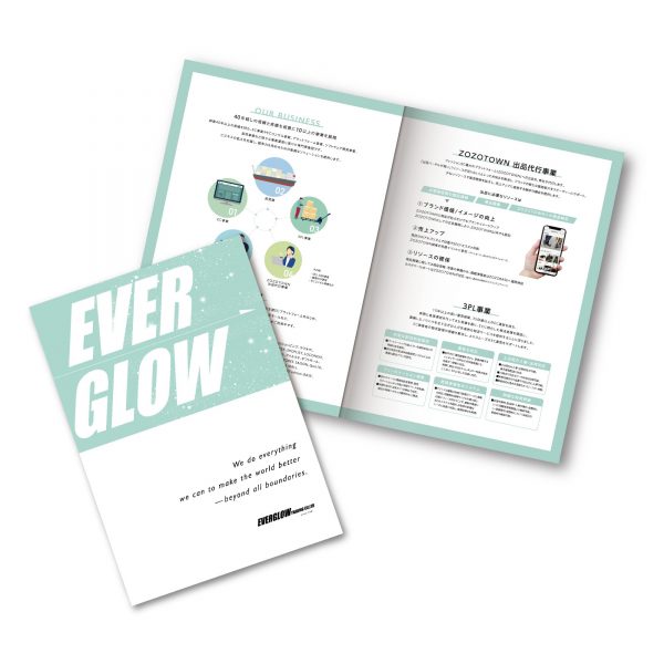 ECビジネスを行なっている企業様の会社案内を制作致しました。 事業のメリットをアイコンとセットでまとめ、知りたい情報を視覚的に配慮しました。