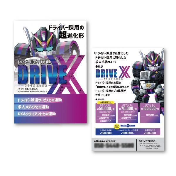 ドライバー派遣を行う企業様の営業案内チラシを制作致しまし。 独自のキャラクターと力強いタイポグラフィで差別化したデザインです。